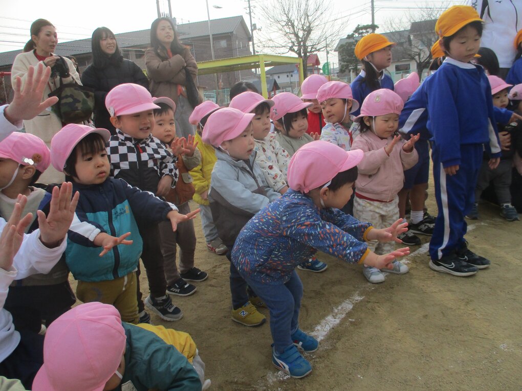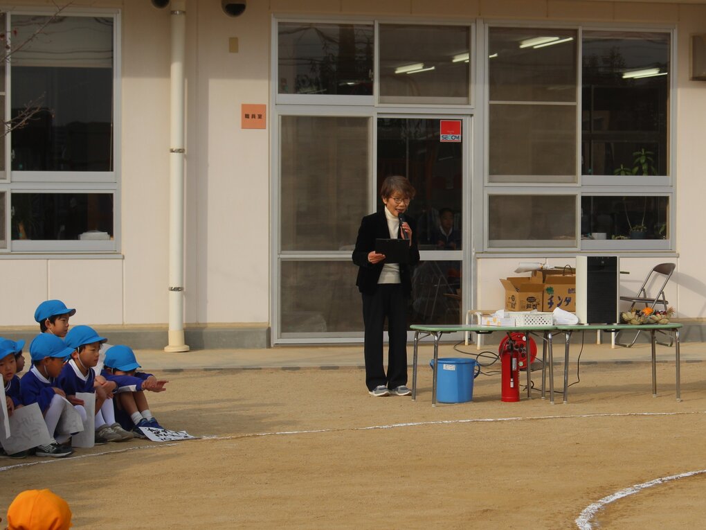 皆で「十二支の歌」を元気に力強く歌い寒さを吹き飛ばした後、園長先生からとんどについてお話がありました。「お正月にお迎えした歳神様を天へ送る日。家族が健康で幸せに暮らせますように。地震も台風もなくお米がたくさん穫れますように。そして、世界中が平和になって、世界中の子ども達が幸せに暮らせますようにとお祈りしましょう。そして、今年頑張りたいことを文字や絵にした書初めも燃やして歳神様を天にお送りしましょう。」