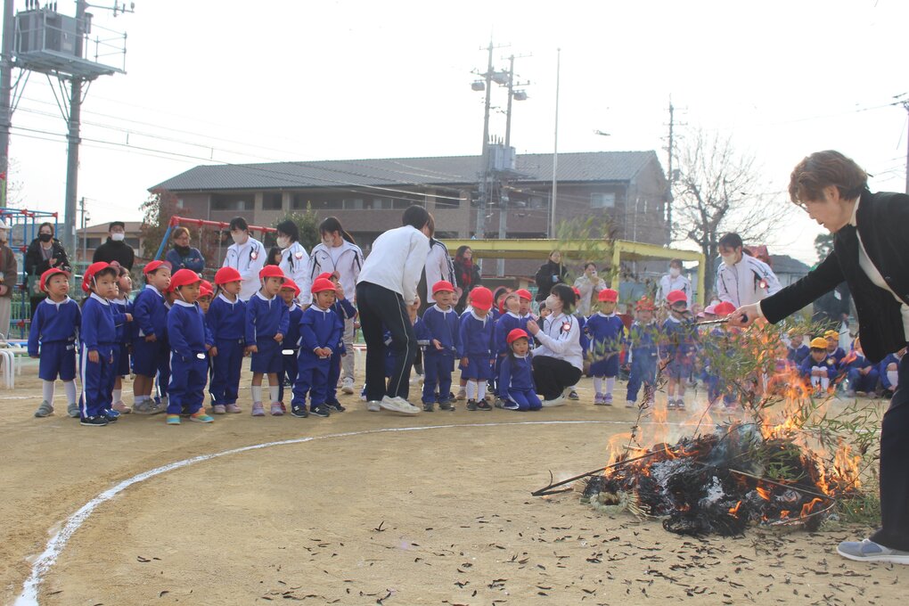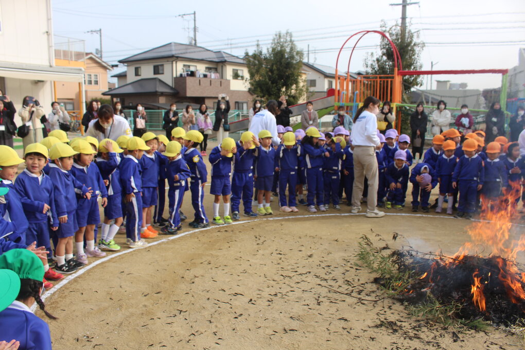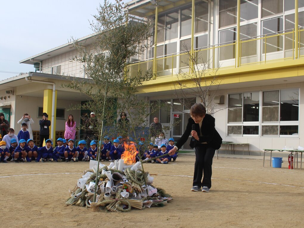 園の皆が輪になり、行事の由来の意味を子どもなりに知ったり、燃え上がる大きな火を見たり、また、新しい年になり挑戦したいことを考えたりする貴重な体験・機会となったのではないかと思います。これからも、家族の健康と幸、そして米が豊作になることを願って生まれた(室町時代)この行事は時代が変わっていっても人間が生きていくために不可欠です。今の子ども達にも大切に、伝えつないでいきたいと思います。
