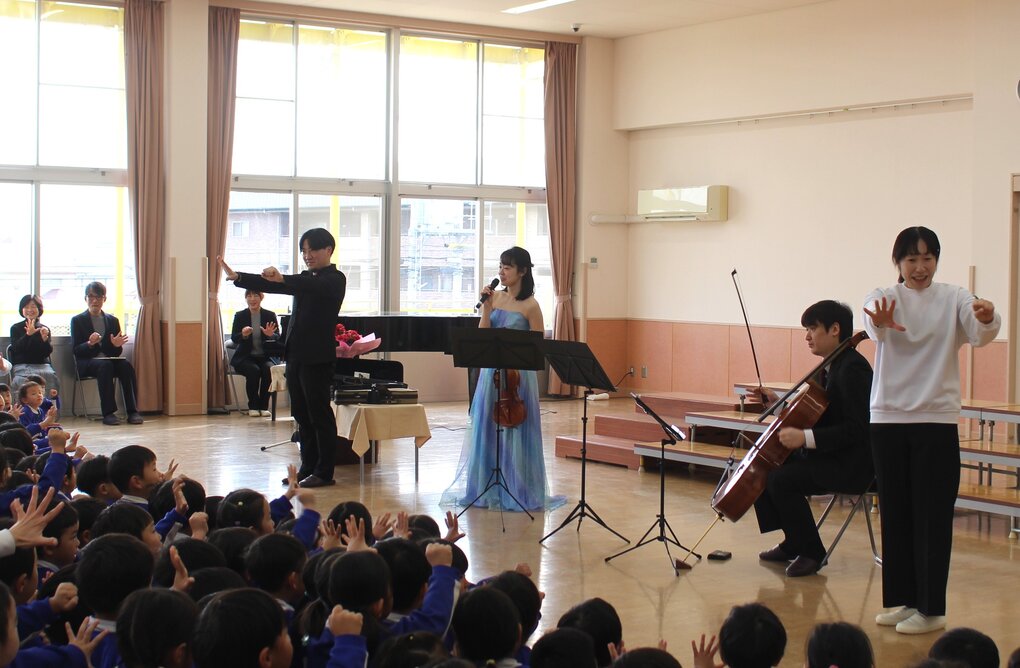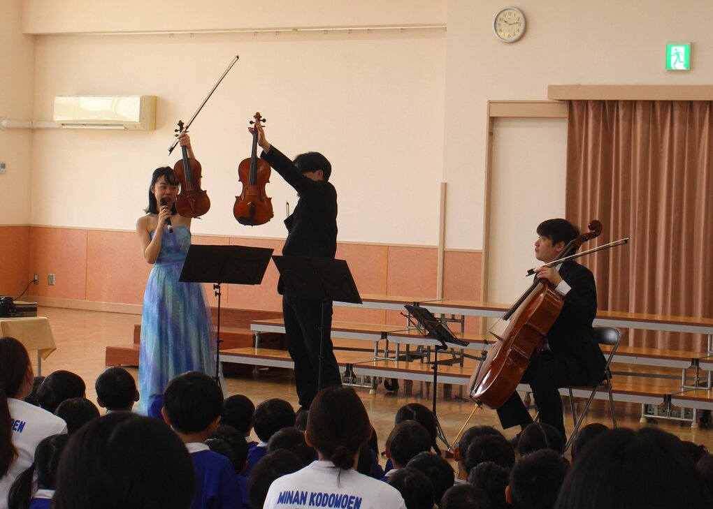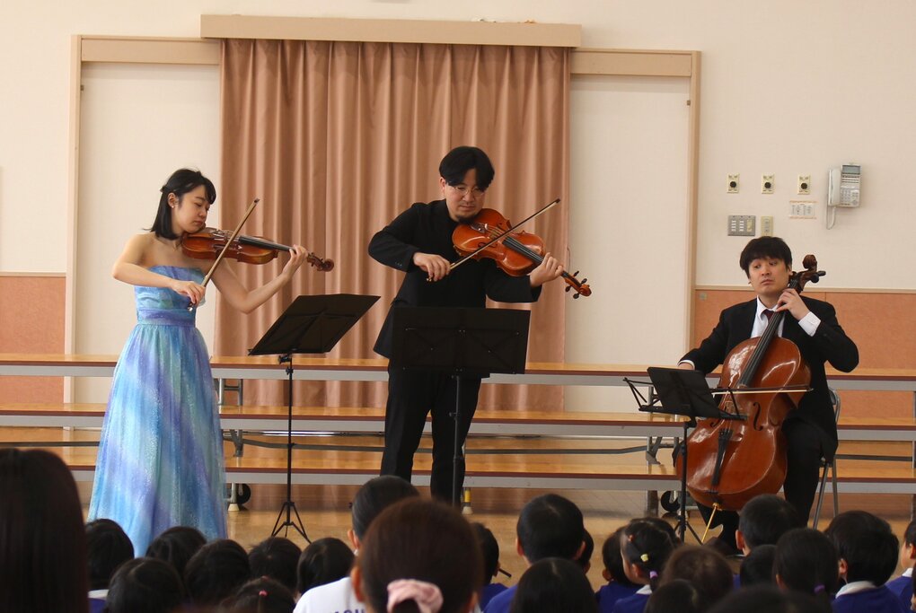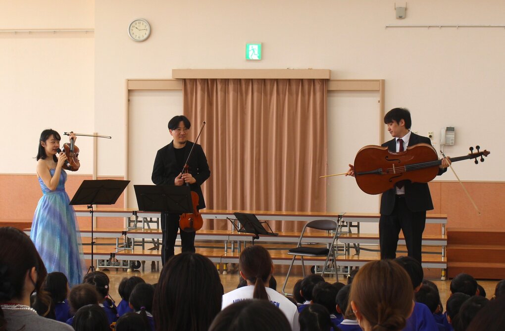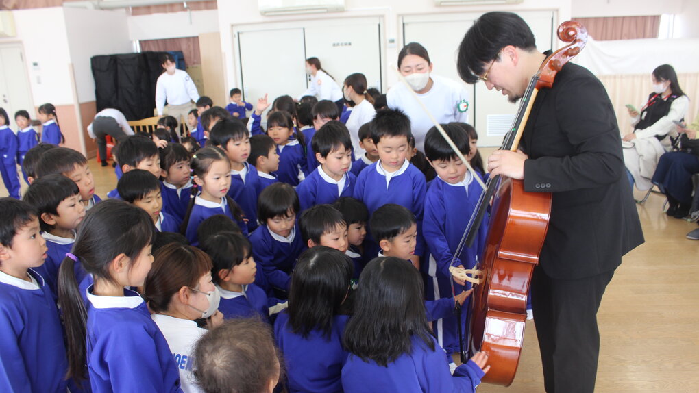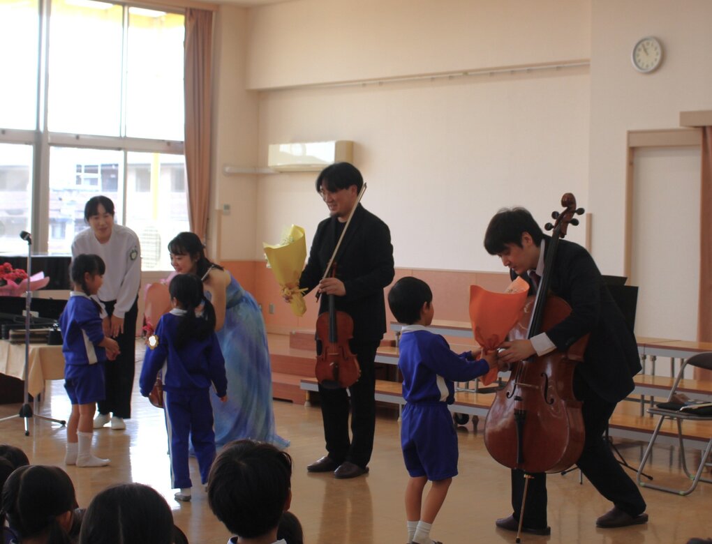 プロの演奏家の方が奏でるヴァイオリン、ヴィオラ、チェロのハーモニーは子ども達の五感を刺激してくれました。美しい音色を前に、目を輝かせてじっと聴き入る子、自然と身体が揺れる子…様々でしたが、どの子も心の中でたくさんのことを感じることができたと思います。これからも日々の中で“心が動く瞬間”を大切にしていきたいと思います。