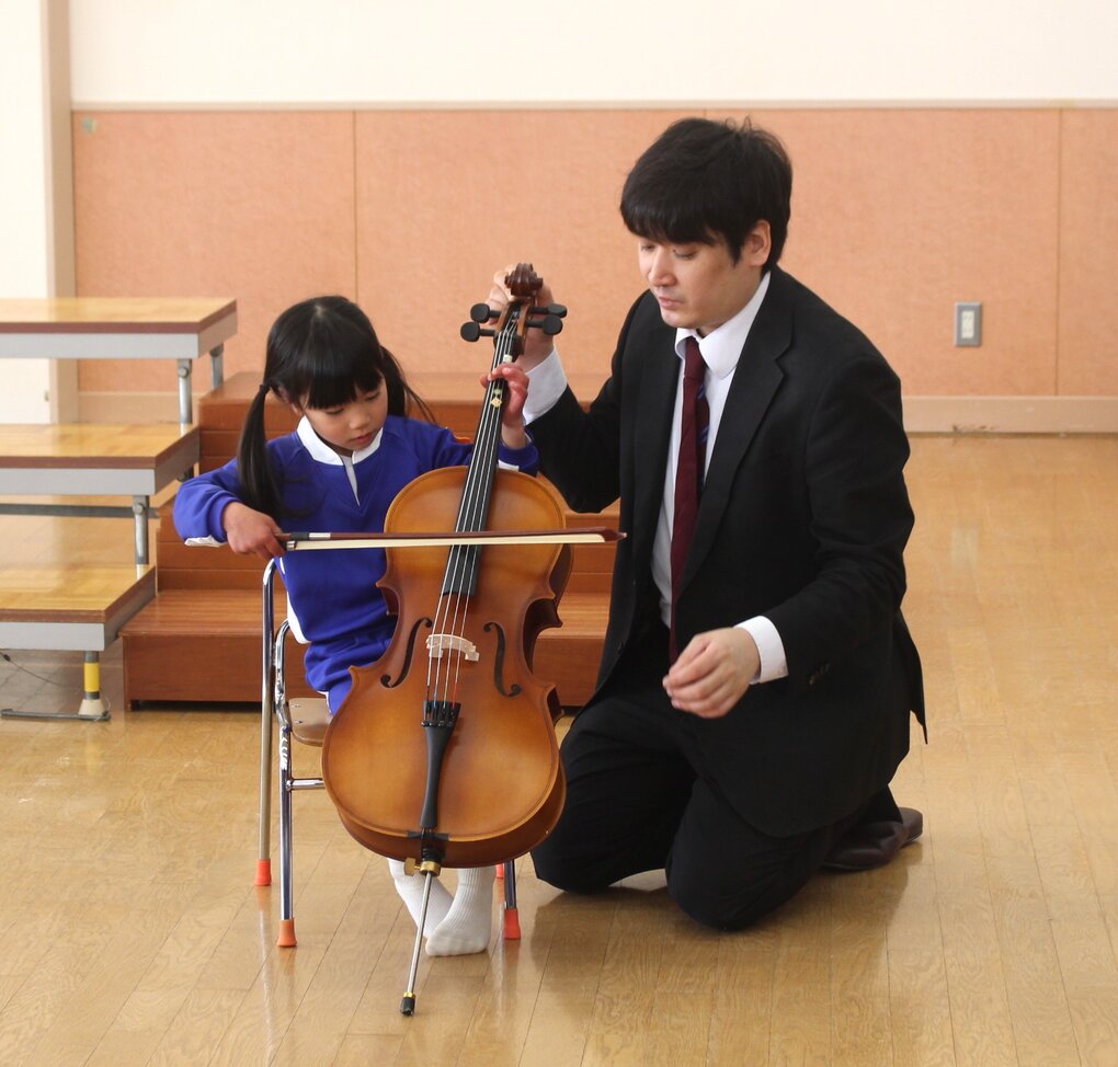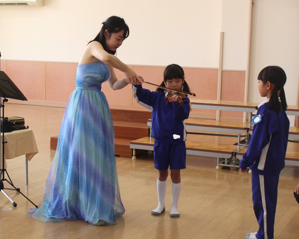 今回は演奏を聴くだけでなく、(全員ではありませんが)実際に楽器に触れる体験もさせていただきました。(子ども用の小さいヴァイオリンとチェロ)持ち方や弓の弾き方を優しく教えてもらい、演奏家になった気分に。音が出た時には“わぁ!”という表情が見られました。