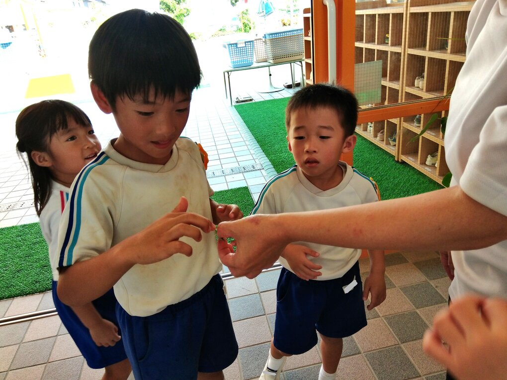 中には興味はあるけれどちょっぴり怖くて初めは蚊帳の外から見ている子も…。しかし、「跳ぶからびっくりしちゃうけれど痛いことしないから大丈夫だよ」「捕まえたら楽しいよ」など恐怖心が和らぐような優しい声を掛けもらうと、触れるように!!「持てたね!怖くないでしょ?」と触れたことを一緒に喜び合う姿も見られました。