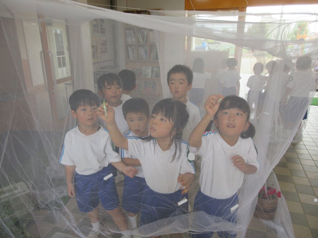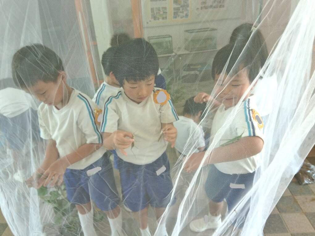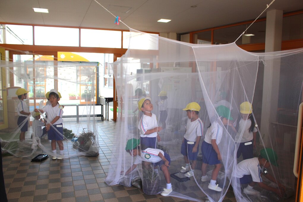 園庭の桜の木も色付き始めたり、コオロギやスズムシの鳴き声が聞こえてきたりと、少しずつ秋めいてきています。子どもたちもお休みの日に見つけた虫を持ってきてくれたり、観察コーナーで虫をじっくり観察したりする姿をよく見かけるようになりました。そこで「蚊帳の中では虫もとんで逃げていかず、小さい年齢の子も安心してじっくり虫とかかわることができるかな…」との思いで、ネイチャーホールに蚊帳を3つ張りました。そして虫たちの住む自然に近い環境を作り、その中に捕まえてきた虫を放ちました。