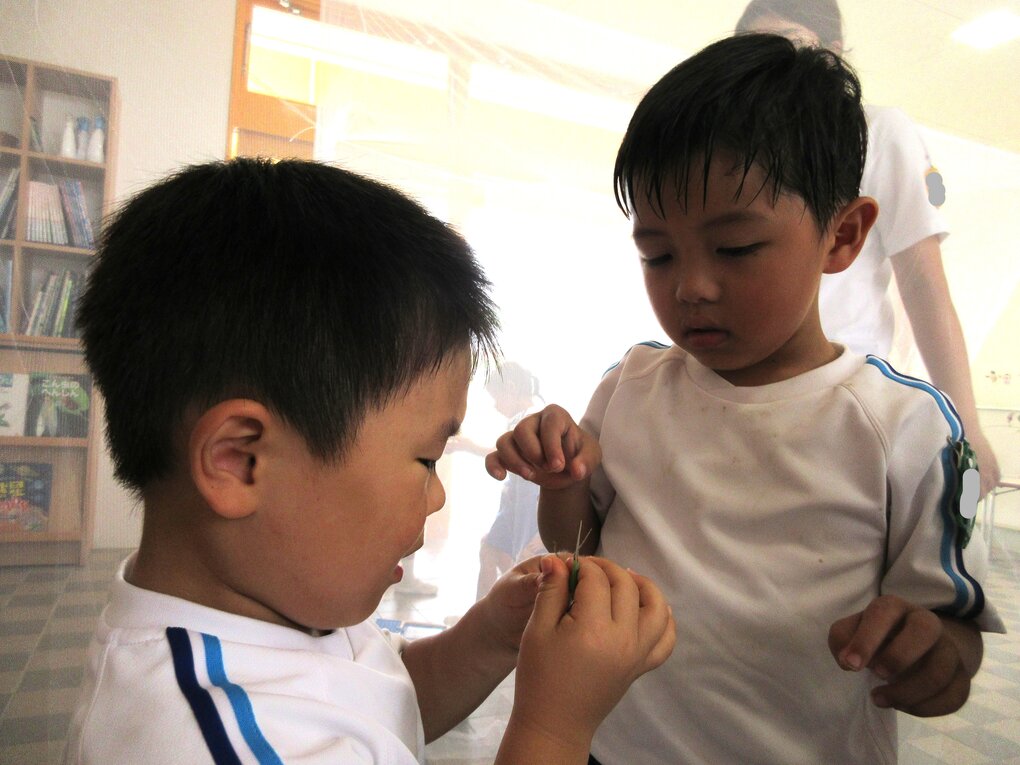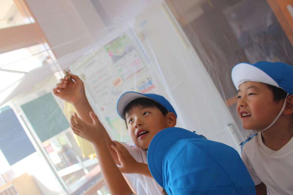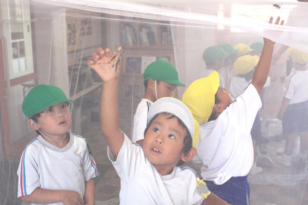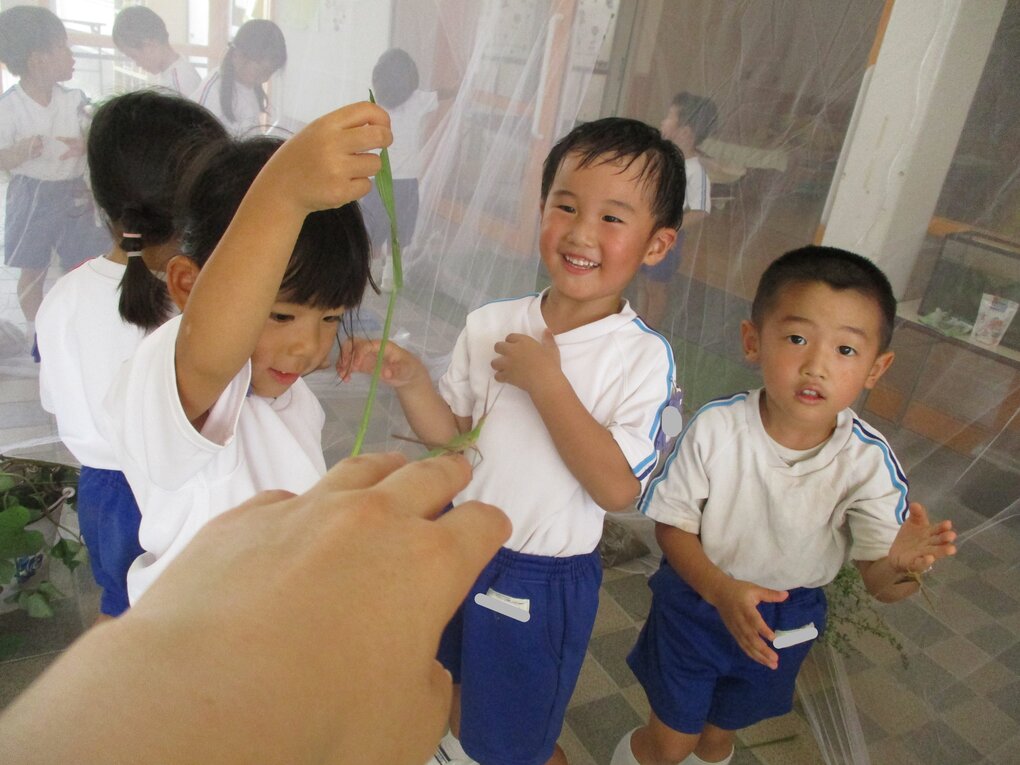 蚊帳の中に入ると、草をかき分け、ワクワクしたようすで探していた子どもたち。色々なところから出てくる秋の虫に大喜び!虫好きの子どもたちにとっては、まるで宝探しのようです。虫を見つけると友達に「そこ(足)じゃなくてこうやって(身体を持って見せながら)持つんだよ!」と持ち方を教えてあげたり、「どこまで跳ぶかみてみよう」「バッタの口ってどこにあるのかな?」と言いながら手に持ってじっくり観察したりと、友達と一緒に見たり触ったりしながら楽しんでいました。
