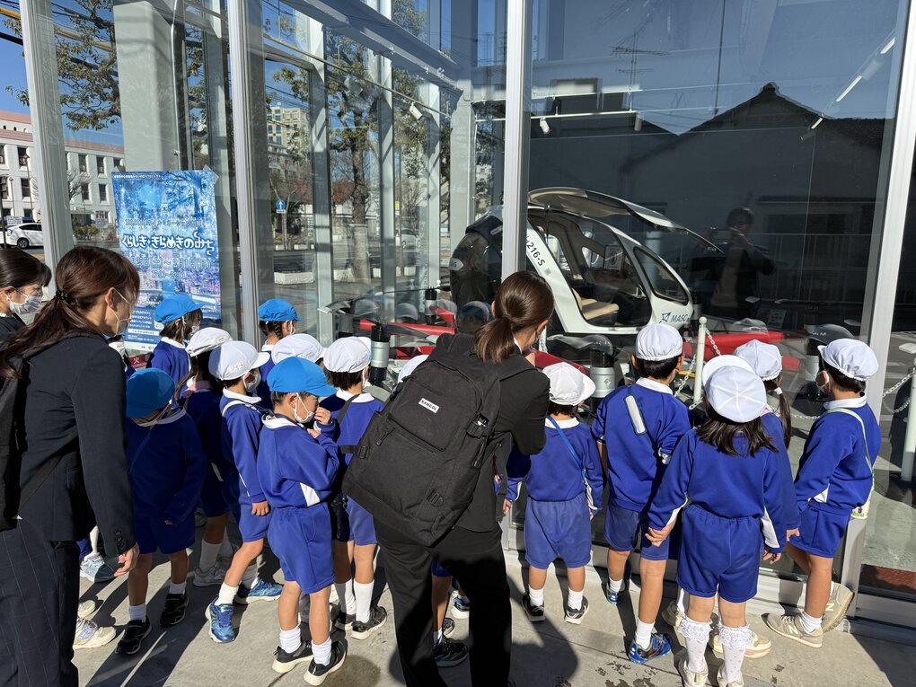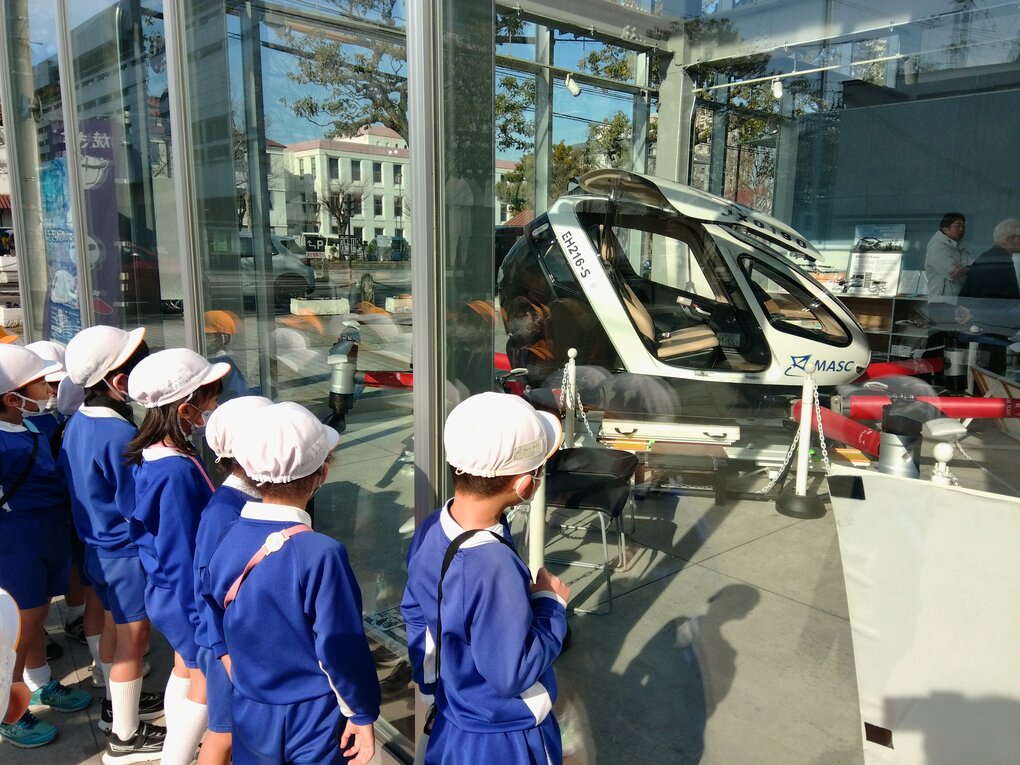 少し寄り道をして空飛ぶ車を見に行きました。「これは車?タイヤがないけど…」「ヘリコプターみたい!」「万博で飛んでいるのをニュースでみたよ!」「空飛ぶ車があったらどこにでも行けるね」と話していました。