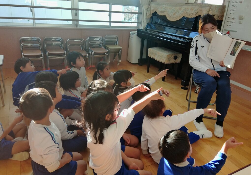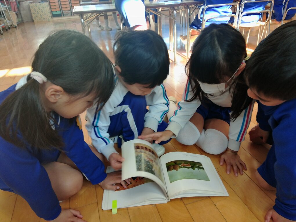 こども園ではじめて大原美術館の画集を見たときは、「すごい“写真”だね」と、率直な感想も聞かれました。これは“絵“ということ、“描いた人が、様々な時代の背景、思いをもって描いた世界にひとつだけの大切な作品“ということを伝えると、「絵なの?すごい…」と、ぐっと心を動かされていた子ども達。一つの絵をじっくりと見るようになりました。そこからお気に入りの絵が見つかったり、一つの作品をじっくりと見て自分なりの思いを友達に言葉で伝えたりし、鑑賞の面白さを味わいながら過ごしてきました。