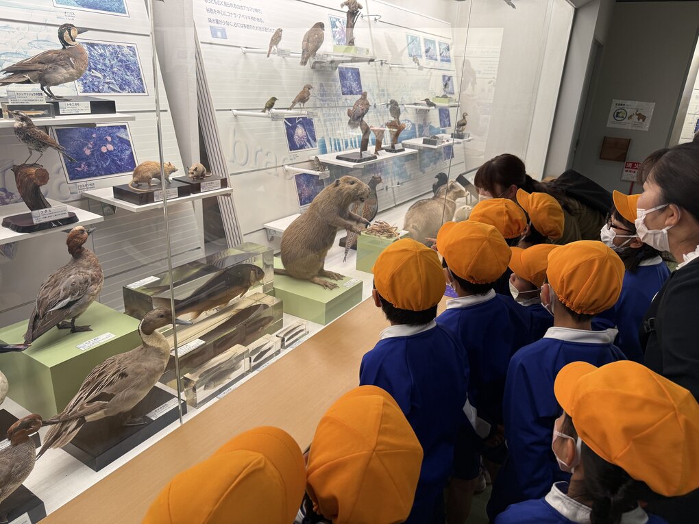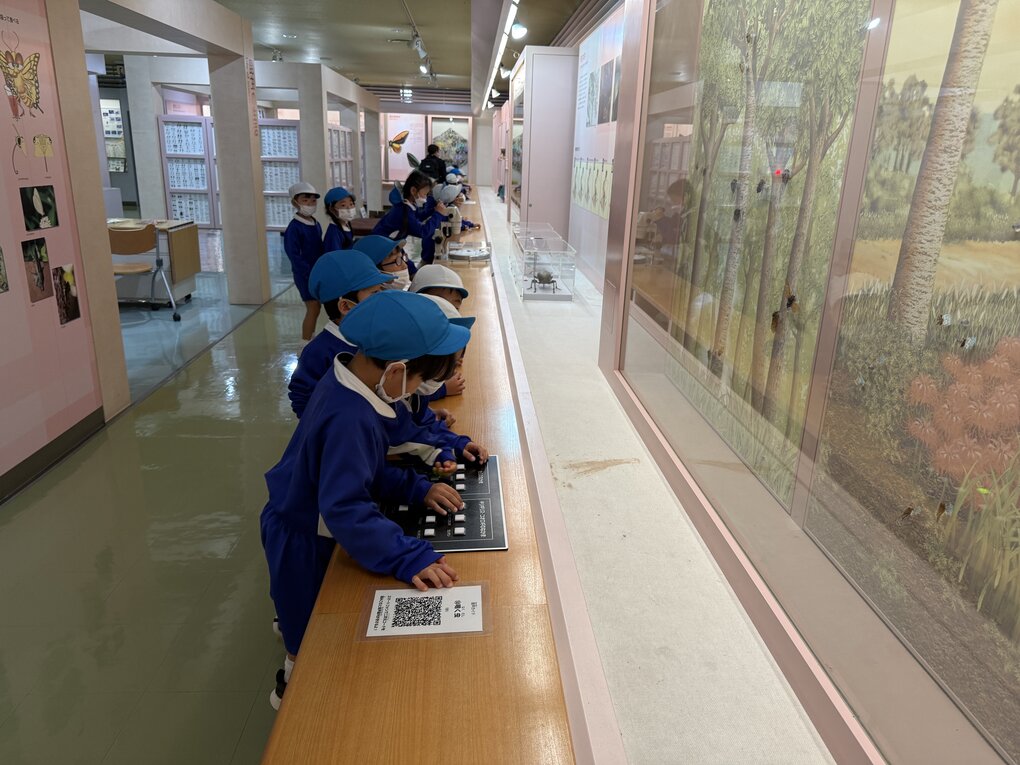 他にもティラノサウルスの顔の骨格模型、岡山に住む生き物のはく製コーナーや世界の昆虫標本コーナーを見て回り、楽しみました。「笹ケ瀬川で見つけたヌートリアがいるよ!歯が黄色いね」「ヒヨドリがいた!」「本物のタヌキってこんな顔なんだ~!」「アカハライモリ見つけた!」「シラサギだ!」「桃太郎のキジってこれだよね?」と目を輝かせていました。