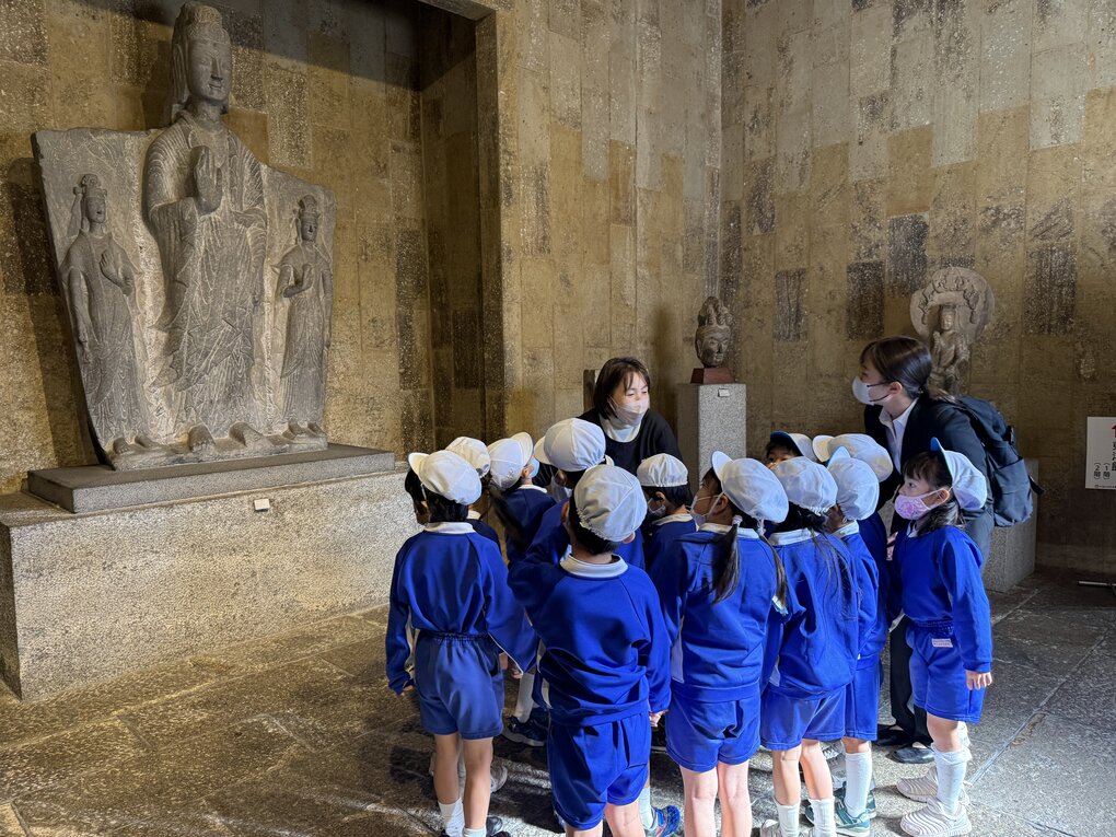 東洋館で印象に残ったのは石仏の部屋。「頭の冠がかわいい」「笑ってるみたい」「頭の上に顔がいっぱいついてる!」「手の形が面白い」などわずかな時間でたくさんの発見をした子ども達。どの子も友達の意見(発表)にしっかりと耳を傾けていました。