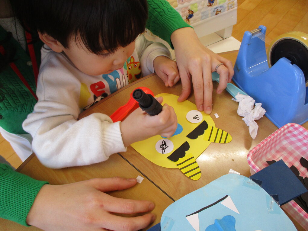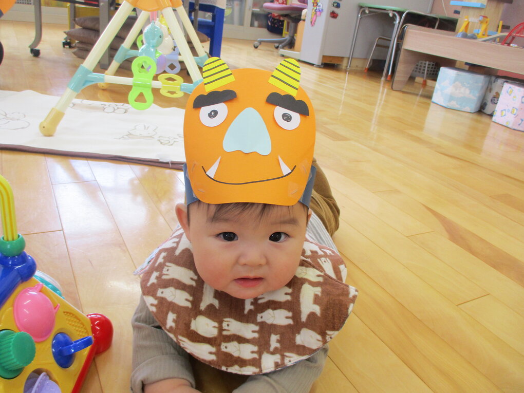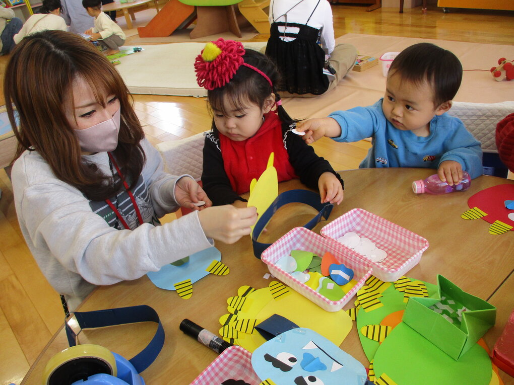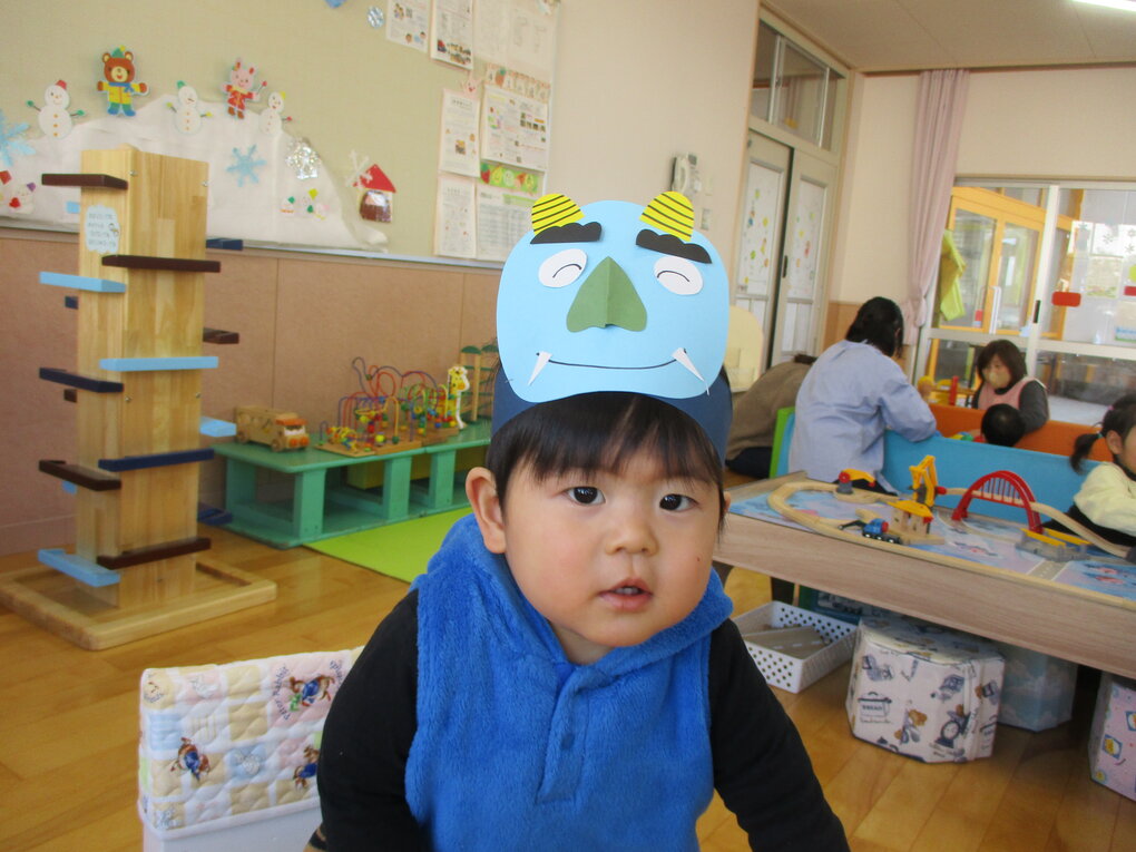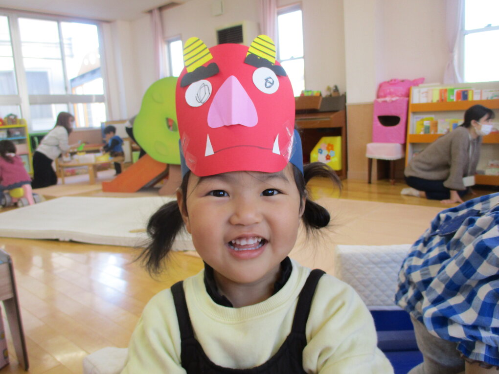 支援センターでは、赤や黄色の可愛らしい鬼さん達が「鬼は外、福は内」と、雑がみで作った豆で豆まきをしました。「これから一年、皆さまが健康で幸せに過ごせますように…」
