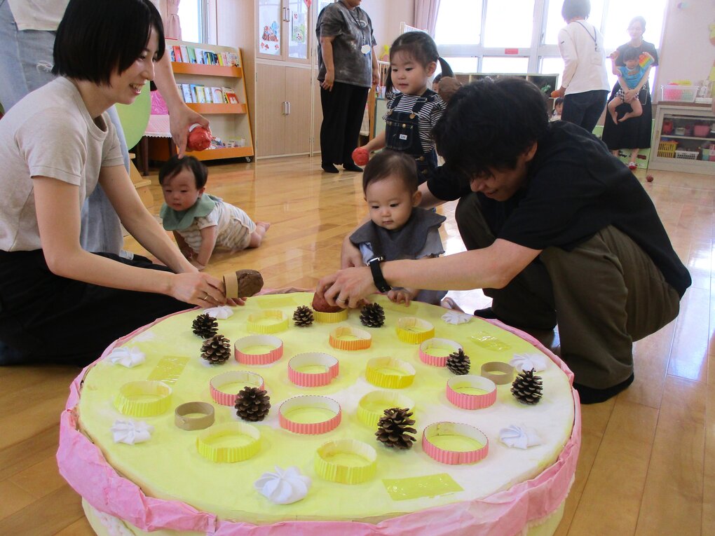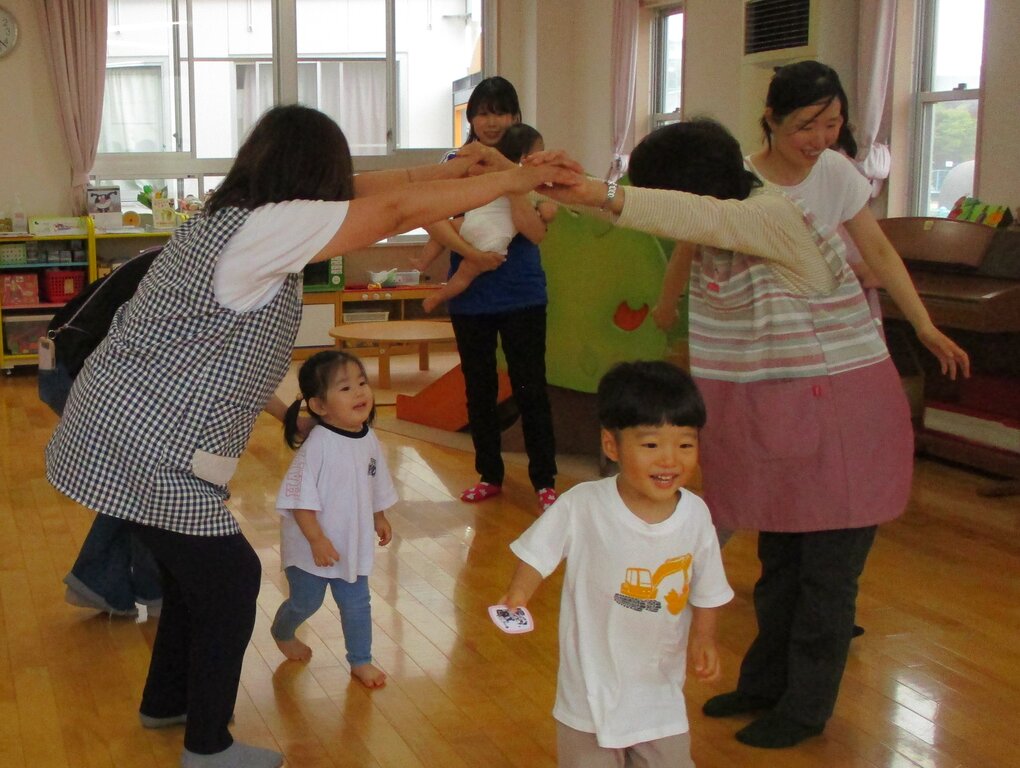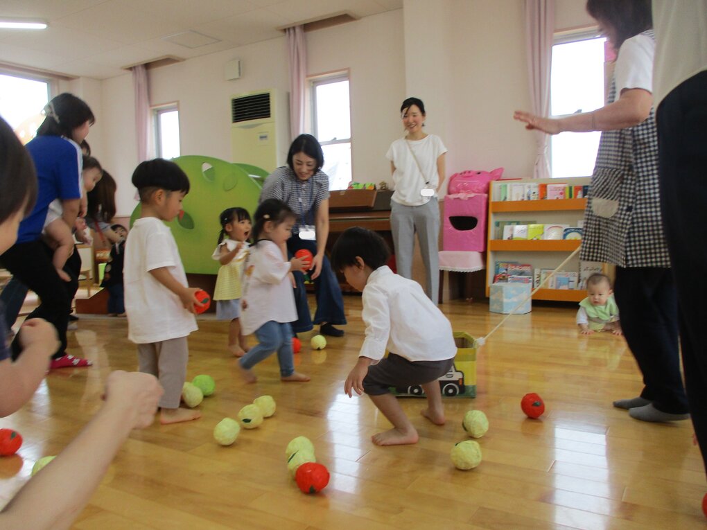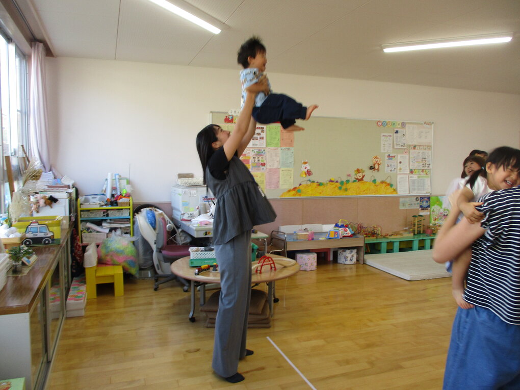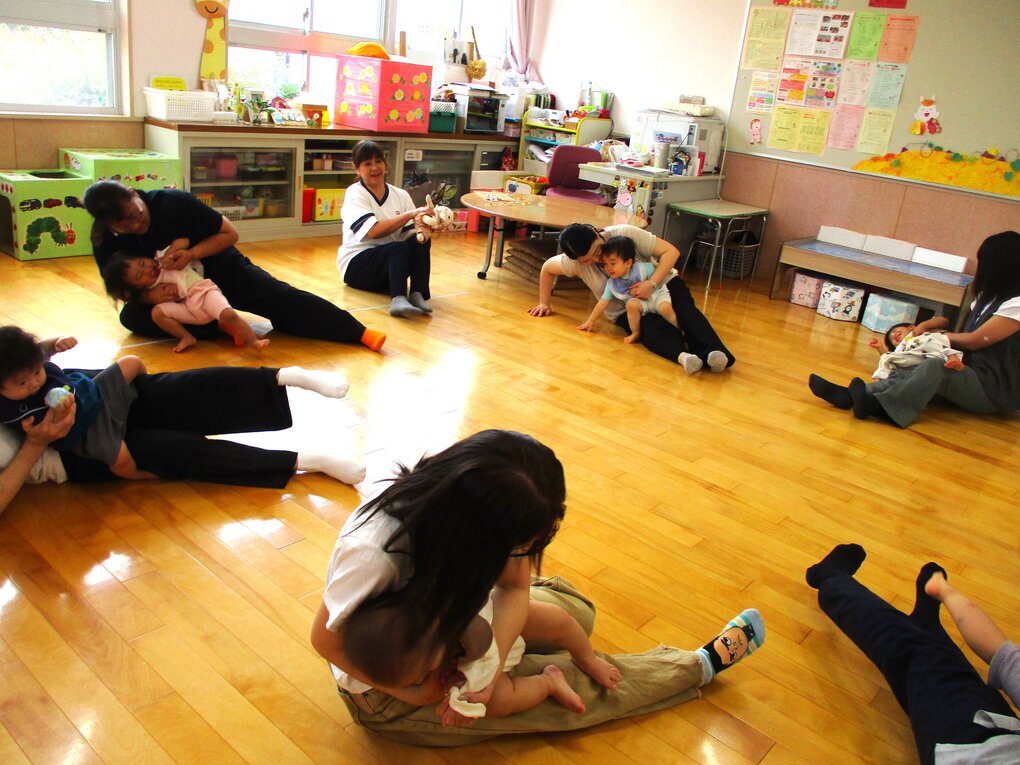 運動会前は室内にて身体を動かし、親子でしっかり“ふれあい”ました。青空の下での運動遊びにしっかりつながりました。