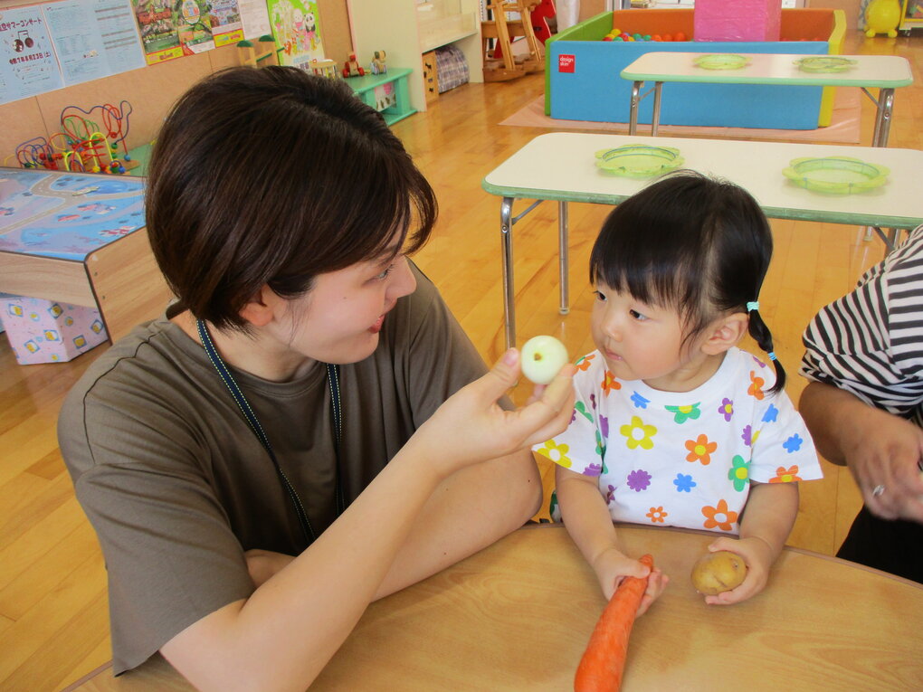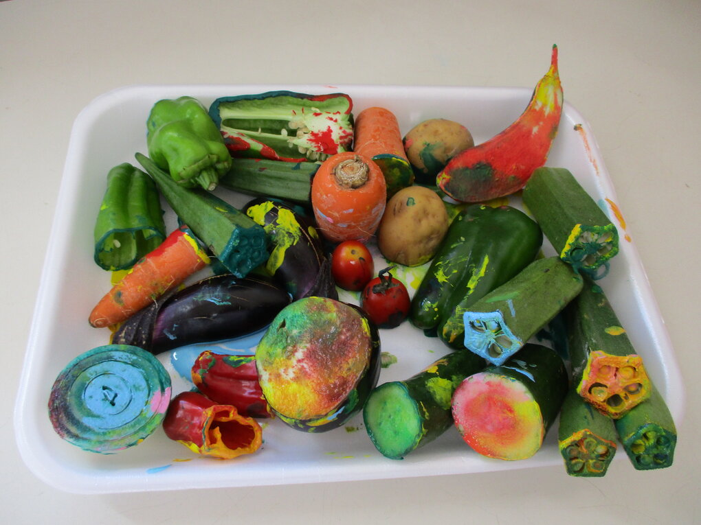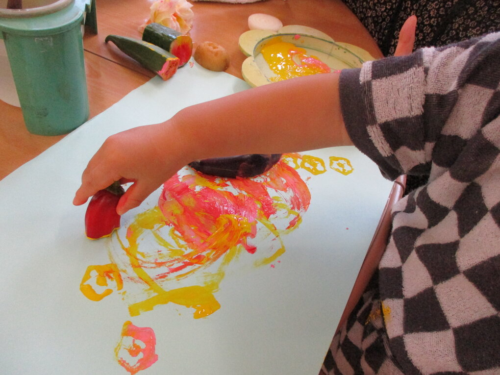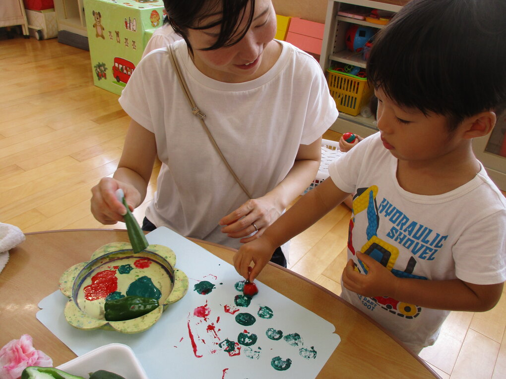 <毎年恒例の夏野菜でスタンプ!「くんくん」匂いを嗅いだり、触ってみたり…形や色を楽しむことができました。>