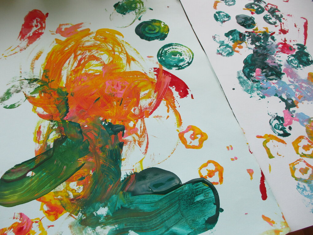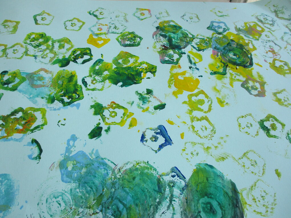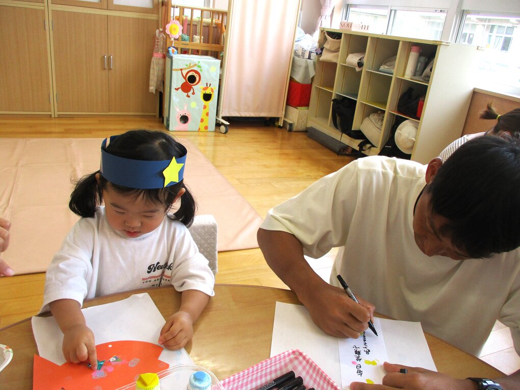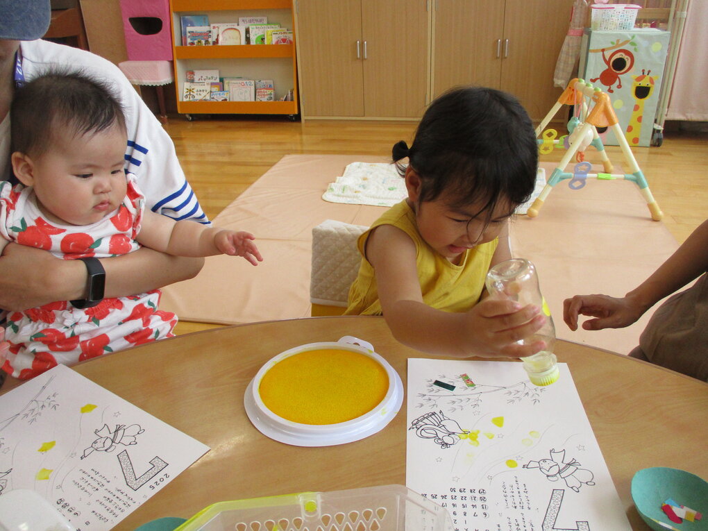 <毎年恒例の夏野菜でスタンプ!「くんくん」匂いを嗅いだり、触ってみたり…形や色を楽しむことができました。>